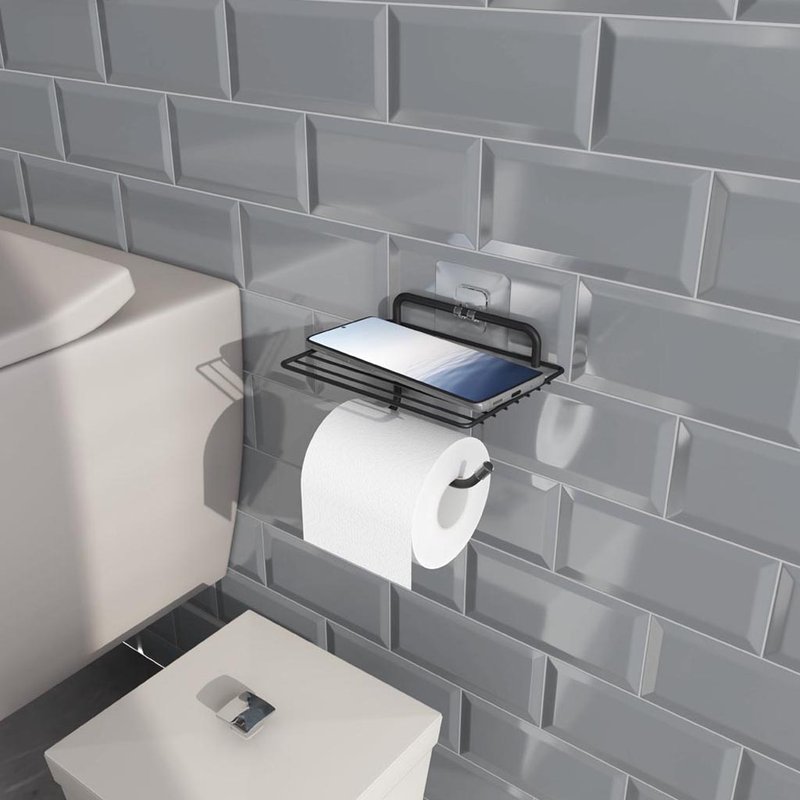Esse Suporte de Papel Higiênico com Prateleira é a solução perfeita pra quem ama praticidade e estilo. Com design moderno em aço e sistema adesivo super resistente, ele dispensa furadeira e ainda traz uma bandeja ideal para apoiar celular, carteira, aromatizador ou pequenos itens.